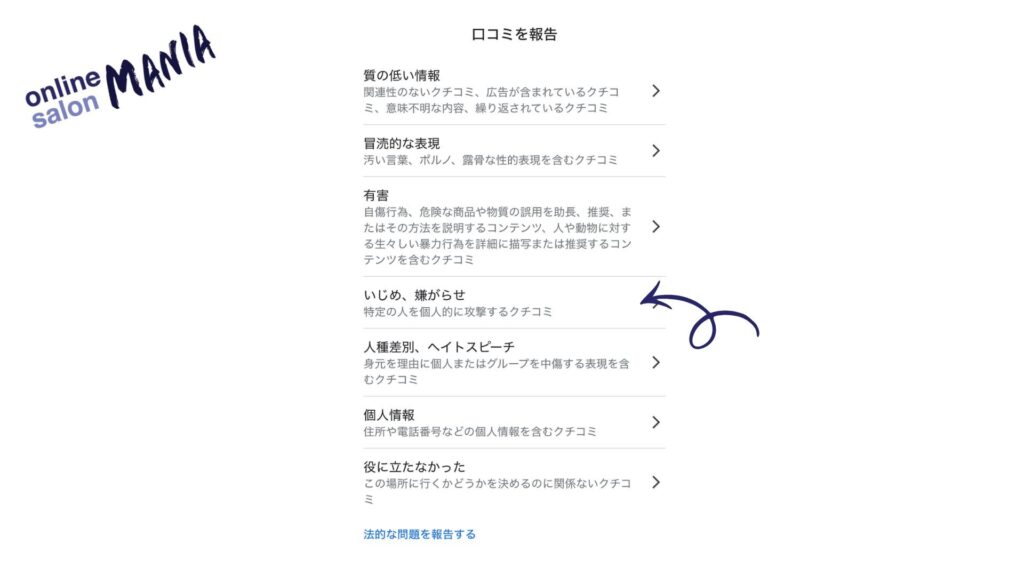 クチコミを報告画面で、「冒涜的な表現」や「有害」・「いじめ・嫌がらせ」など該当の項目から報告する