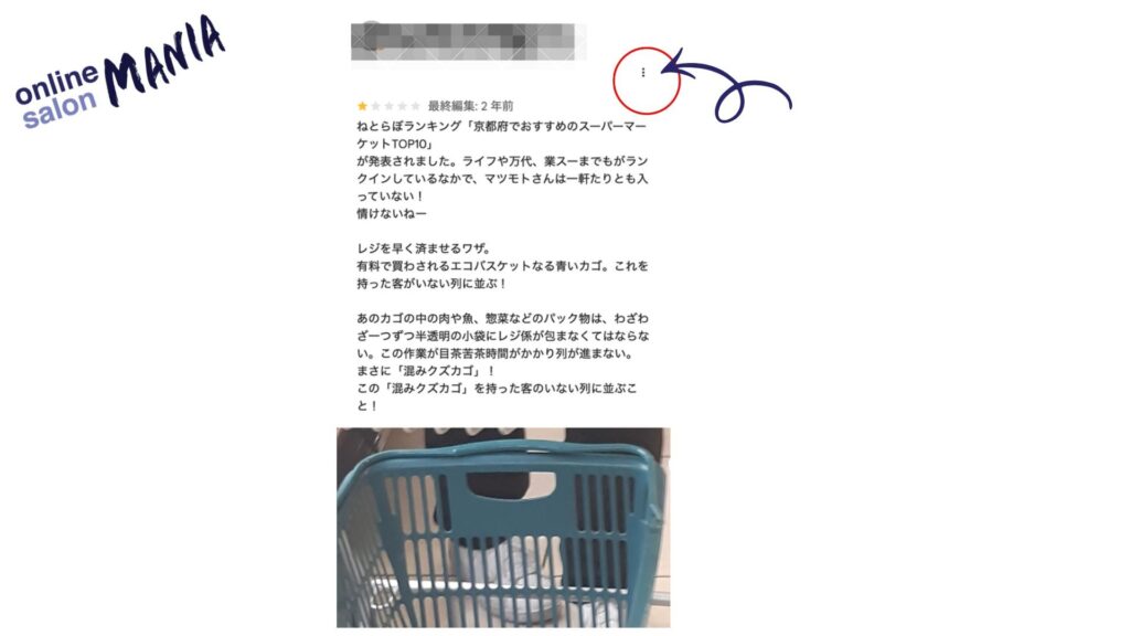 Googleの該当口コミを見つけ、右上にある縦点3つをタップする