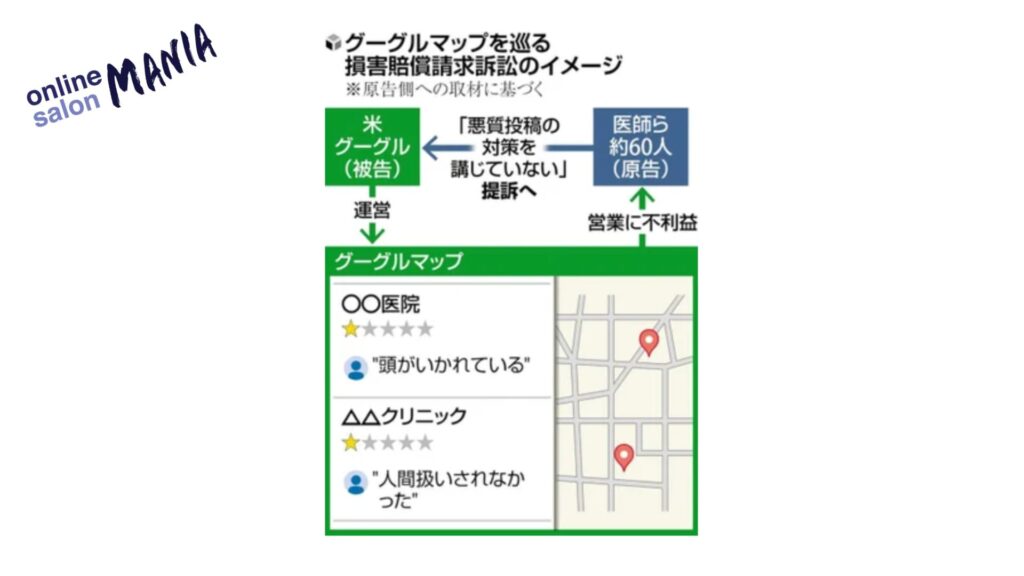 Googleマップにある口コミ欄に「一方的に投稿された悪評を放置されて営業権を侵害された」として全国の医師らが、Googleに損害賠償を求める集団訴訟を起こしました。