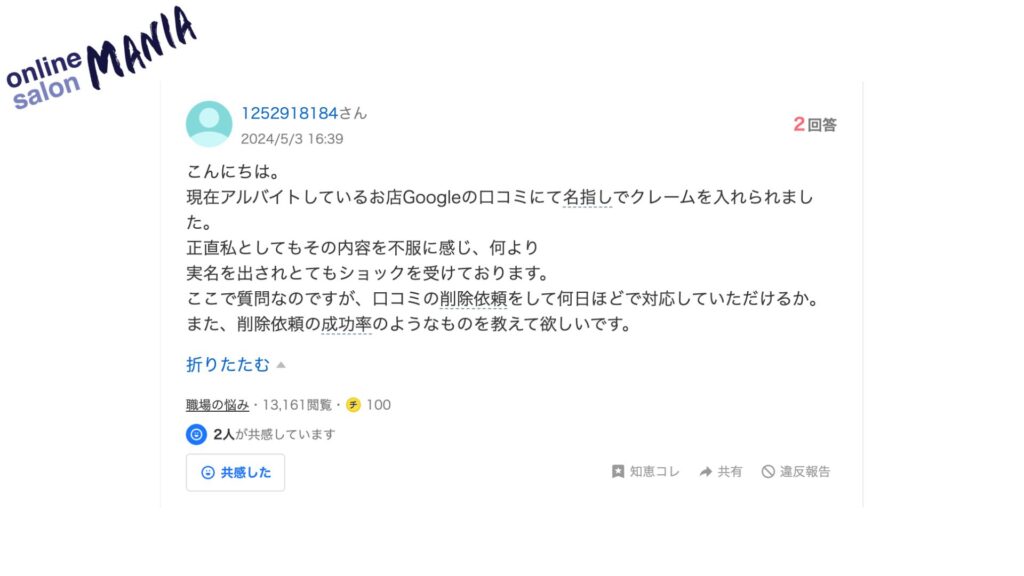 Googleでは「Googleポリシーに違反する口コミを見つけた場合、報告して削除を求められる」とあります。