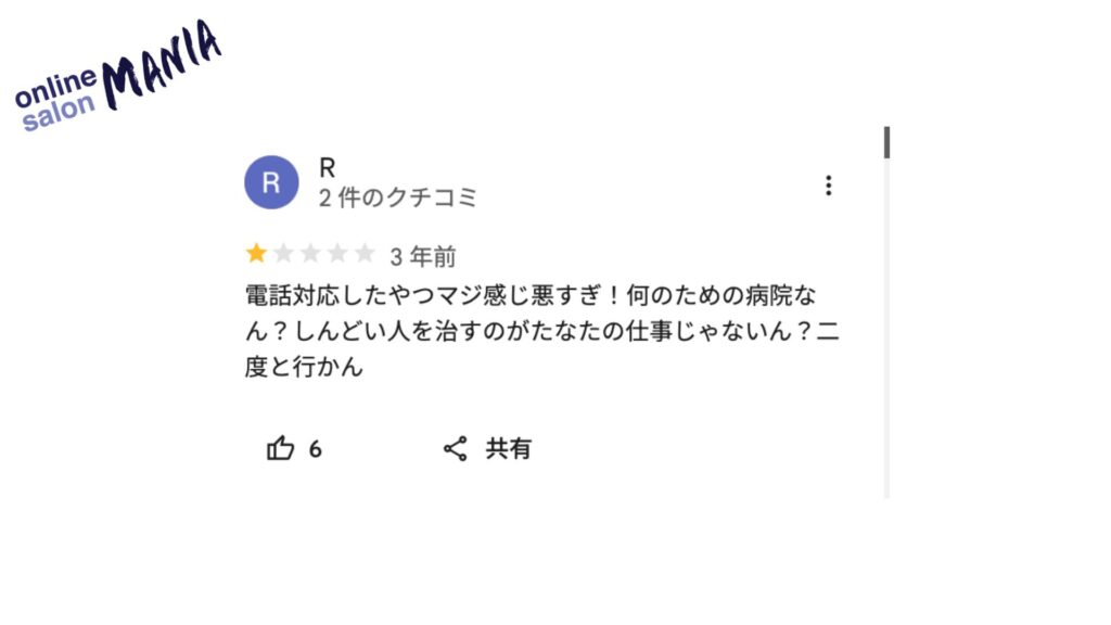 最初に紹介するのは、必要以上に攻撃的な口コミです。病院に電話した際の、対応された受け付けに対する口コミです。
